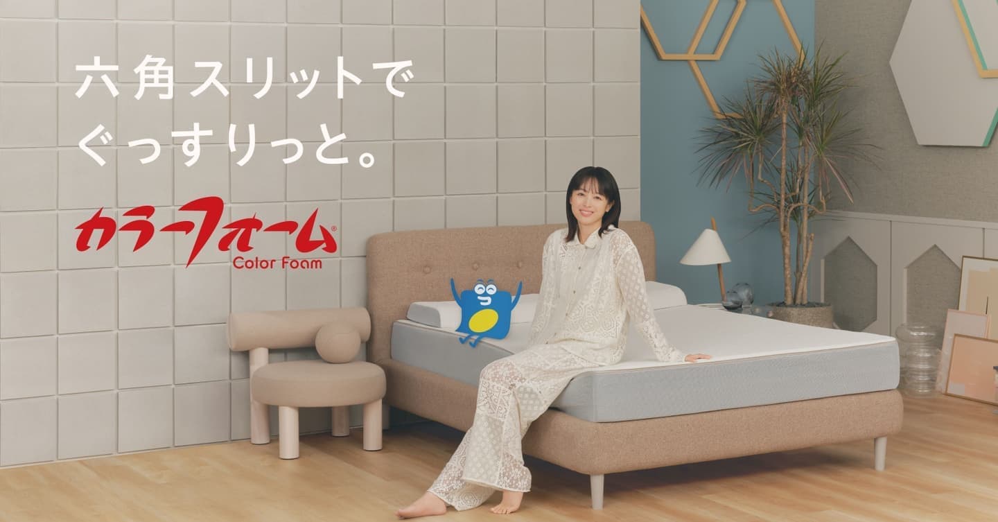 さらにポップな寝室のインテリアや清野さんが着用するメガネのフレームなど、至る所にカラーフォームマットレスの特徴である“六角形”が隠れています。
